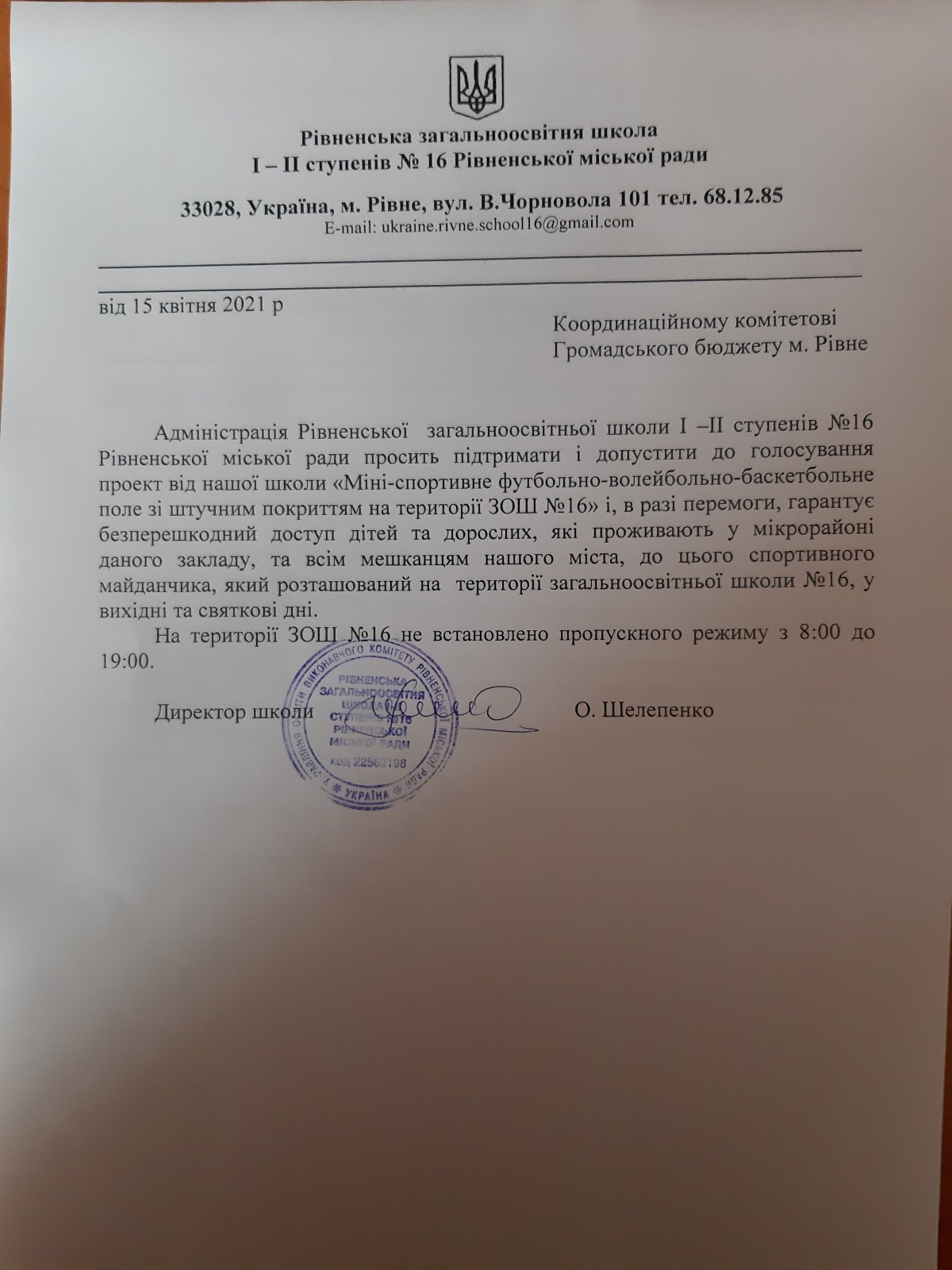Спортивне футбольно-волейбольно-баскетбольне поле зі штучним покриттям на території ЗОШ 16 матиме розмір 42 м на 22 м, буде оздоблене огорожею та невеликими глядацькими трибунами. Проєкт розрахований на різні вікові категорії та забезпечить загальнодоступність занять спортом мешканців мікрорайону, адже доступ до спортивного майданчика матимуть усі охочі.